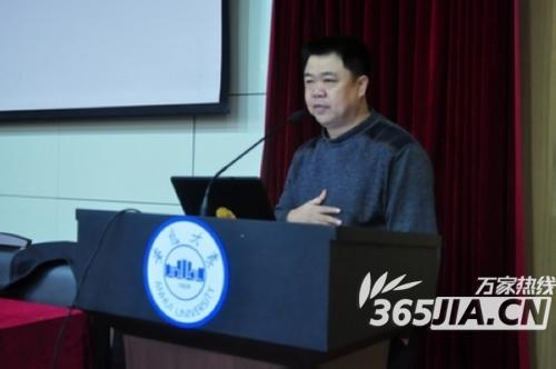 图为万家热线总编辑刘炜在安大罄苑校区作关于都市媒体发展趋势的报告